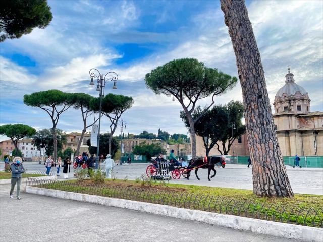 フォーリ・インペリアーリ通りを、観光客を乗せた観光馬車のお馬さんが一生懸命に走ります。長い間、たくさんのお馬さんも出番がなく、厩舎でくつろいで出勤できる日が来るのを待っていました。