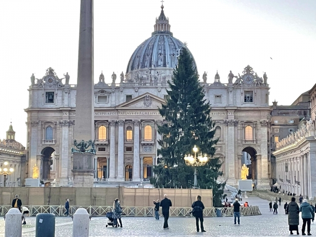 バチカン市国のサン・ピエトロ広場の様子です。サン・ピエトロ大聖堂前の広場に、11月23日にクリスマスツリーが到着しました。モミの木は、毎年異なる場所よりやって来ます。今年は、北イタリアのトレント自治県の東アルプスのドロミティの森から運んでこられました。遠いアルプスを出発し、何日もの長旅を経てローマに到着した赤モミの木の樹齢は113歳です。