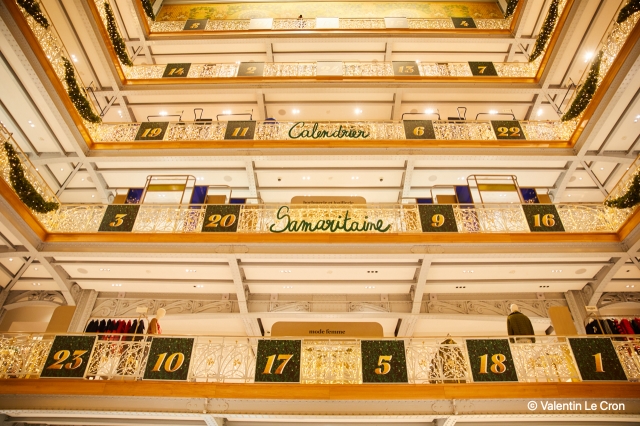 館内はカラフルなギャラリー・ラファイエットとは対照的に、ゴールドで統一されとても落ち着いた雰囲気。冬のフランス庭園をモチーフに、フランスの伝統的なクリスマスをシックに表現しています。特に目を引くのが吹き抜けを使い飾られた巨大なアドベントカレンダー(クリスマスまでの日付を数えるカレンダー)です。毎日お昼の12時24分になると、日替わりで驚きの発表があります。