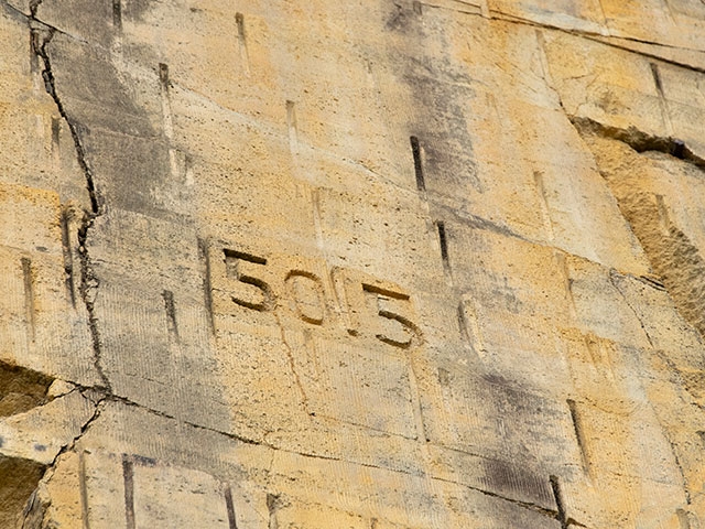 目の前に覆いかぶさるように垂直に聳え立つ石壁。その高さは50m超。壁面には正確に切り出されたであろう採石跡や頭上はるかに彫刻された採石年月が見られ、その当時の作業の様子をうかがい知ることができます。