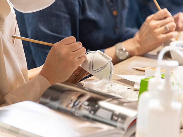 そんな九谷焼の工房は、どれほど敷居が高いのだろうと思いながら、まずは德田八十吉陶房へ。人間国宝を父に持つ四代八十吉氏は、2019年に大病を患い、その経験から構想を得た作品をも発表する情熱あふれる作家です。作陶の工程や色やモチーフに関する話をうかがっていると、気さくさの中に作品にかける深い想いが伝わってきます。