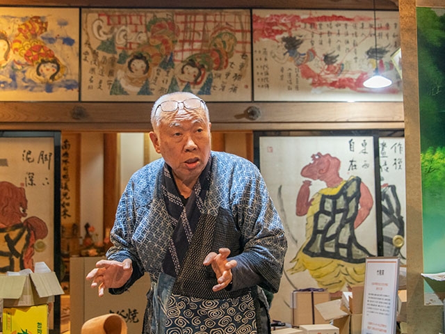 ちなみに竹隆窯の工房建物は、富山県利賀村(現在の富山県南砺市・五箇山エリア)にあった念仏道場を移築したものだそうです。工房内部は、東大寺の故清水公照氏による襖絵や小松城から移築した茶室、総檜造りの仏間といった、さながら博物館のよう。パワフルな初代から繰り出される一言ひとことには、ものづくりへのこだわりと歴史と文化があふれていました。竹隆窯は進化する「クタニ」を発信する、エネルギー満載の工房です。