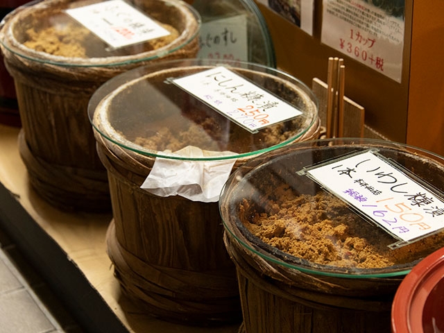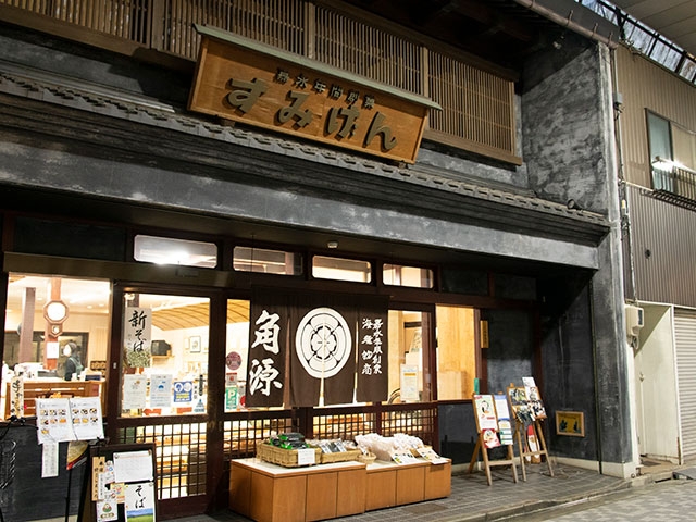 小松市三日市町にある海産物商、角源(すみげん)の創業は、かつて北前船によって運ばれてきた海産物で商いを始めたことに由来しています。その時代とは江戸末期。以来150年以上もの間、代々の後継者によってのれんが守られてきた小松の老舗です。町家づくりの建物内には、この地域の伝統的な保存食である糠漬けや粕漬け、名産の佃煮など、お酒や御飯が進みそうなものばかり。小松に来たら、ぜひとも立ち寄っていただきたい。