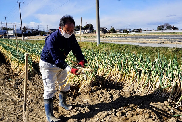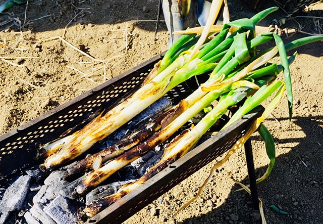 熊谷産の妻沼(めぬま)ネギは、白根の部分が長く、やわらかで甘みが強いのが特徴。ネギ栽培のほか、養蜂や循環型農業に取り組んでいる農園・遠藤ファームで、鍋料理に欠かせないおいしいネギの食べ方を教えていただきました。熱を加えることによって、一層甘味が増すネギをよりおいしく食べるコツは、まず熱を加えてから切ることがポイント。ネギをそのまま一本炭火で焼き、皮をはいでまるかじりすると、ネギそのものの甘みを味わえます。