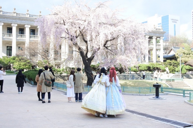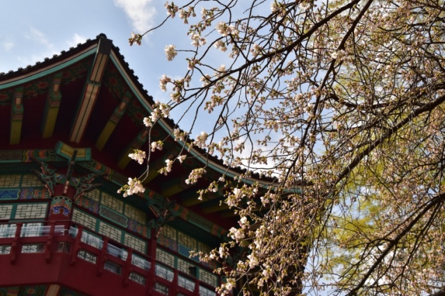 石造殿の前には枝垂れ桜があり、筆者が訪れた時はここで多くの人が写真を撮っていました。コロナが流行する前は海外からの観光客も多く訪れ、ハンボクという韓国伝統衣装をレンタルして写真を撮るのが人気でした。