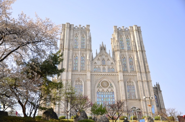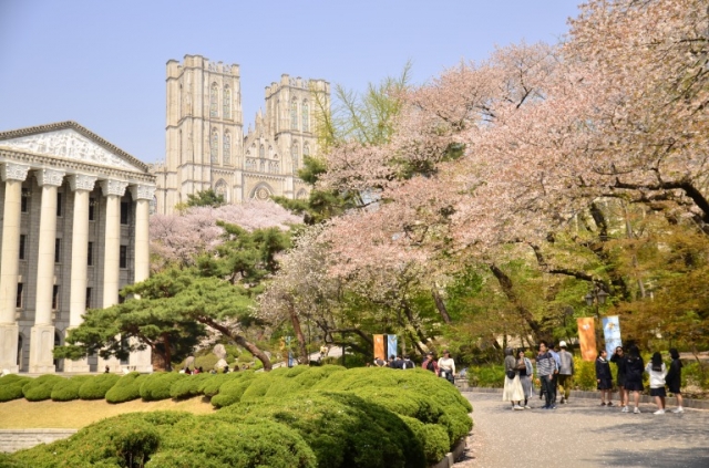 東大門から少し北にある慶煕(キョンヒ)大学。金大中、文在寅といった歴代大統領を輩出した名門の私立大学です。校門を抜けてまっすぐ進むと、大きな噴水と本館があり、桜の時期はフォトスポットとして近所の人が多く訪れます。キャンパス内には大学の建物だけでなく、付属の小学校、中学校、高校もあるので、ひとつの大きなキャンパスタウンのようになっています。元々は小さな山だった場所を切り拓いて建てられた場所のため、大学の建物に上ると桜とともにキャンパスを見わたすことができます。