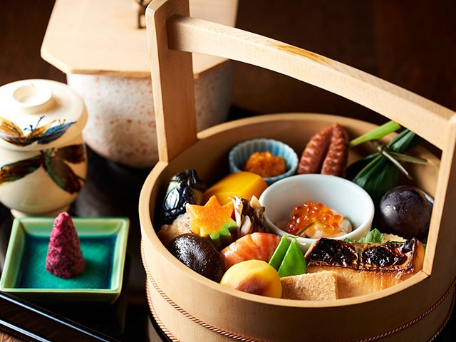 お花見をたっぷり楽しんだあとは、疎水北側にたたずむ京料理の老舗店へ。明治の創業から京料理一筋で営んできた名店です。ランチのおすすめは、四季折々の食材をさまざまな味付けで手桶に盛り込んだ「手おけ弁当」。美しい白木の手桶は、人間国宝の中川清司氏作のもの。繊細な味付けと美しい器で京の粋を感じさせてくれます。日替わりのお弁当は前日まで予約でテイクアウトもできます。