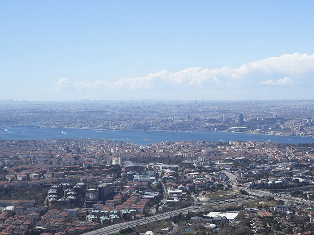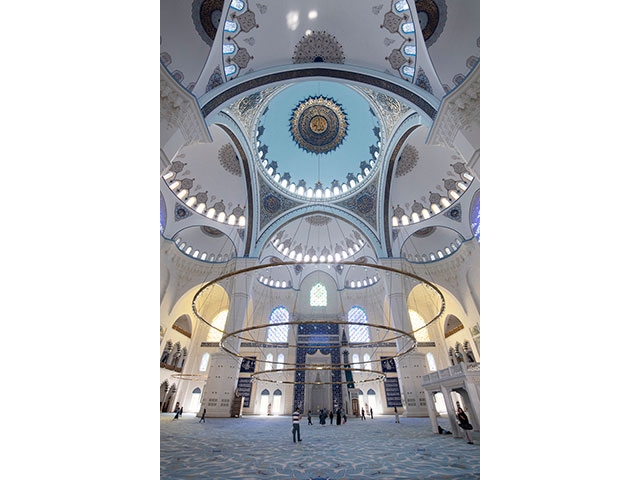 ヨーロッパ側からアジア側を眺めると、6本のミナーレ(尖塔)をもつ建物が目に入ってきます。これが6万3000人を収容するトルコ最大のジャーミィ、チャムルジャ・ジャーミィです。2019年に完成したばかりですが、その姿は歴史地区にあるスルタンアフメット・ジャーミィ(ブルーモスク)やスュレイマニエ・ジャーミィによく似た伝統建築を踏襲しており、大きいだけでなく、調和と繊細さを感じさせる寺院になっています。内部は白を基調としながらも、天井や壁の所々にアラベスク紋様やイスラーム書道による装飾が施され、新しくも見応えたっぷり。