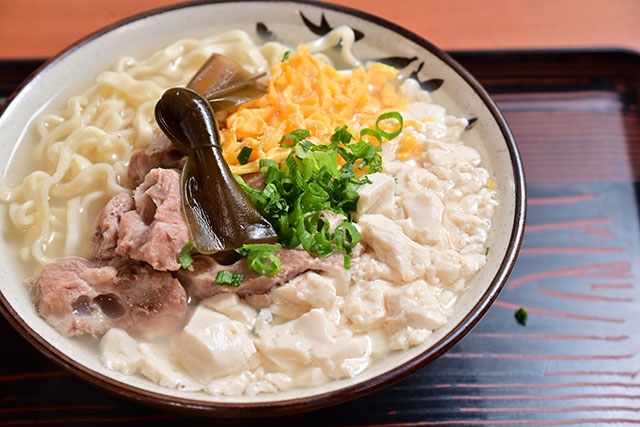 浦添の住宅街にある店「高江洲そば」。朝10:00の開店と当時にお客さんが入ってきて、たちまち満席になります。いただいたのはもちろん「ゆし豆腐そば」。たっぷり入ったゆし豆腐はふわっふわの食感で、スープがあっさりしているから豆腐の味もしっかりと舌に残ります。ぷるぷるの軟骨ソーキに、昆布、錦糸玉子と具もひとつひとつ個性がありながらもまとまっています。クセがなくすっきりとした味なので、朝、昼、晩といつでも食べたくなります。ただし夜はやっていません。