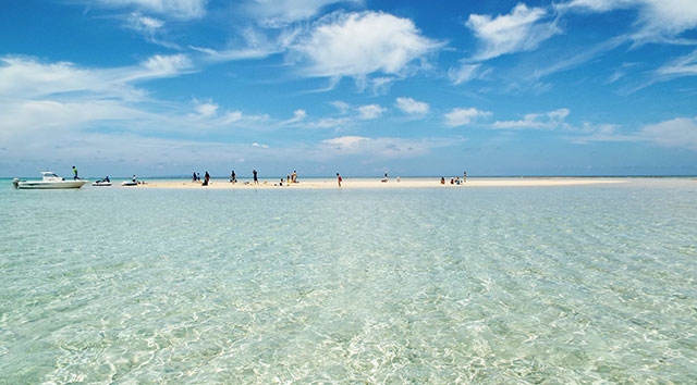 与論島東海岸にある大金久海岸の沖、約1.5kmのところに、春~夏の中潮から大潮の干潮時のみ出現する砂浜です。海にぽっかりと現れた純白の砂浜のまわりはきらめくクリスタルブルーの海。地上の楽園とはまさにこのこと!