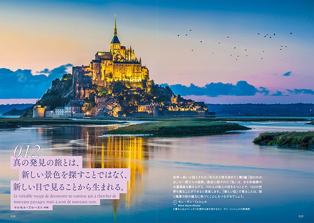 100の名言は、それぞれフランスの美しい風景写真とともに紹介されています。ことばのイメージにぴったり合う風景であったり、引用元である小説や詩の舞台、また偉人ゆかりの場所であったり。モン・サン・ミッシェルなどフランスを代表する観光名所はもちろん、知られざる絶景も多数登場します。ページをめくるたびに、フランス各地の魅力的な写真が現れ、旅心を誘われます。それぞれ地名が明記されているので、次の旅先を決めるための、案内本ともなってくれるに違いありません。