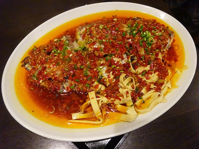 辛さでは四川料理以上といわれる湖南料理を代表する魚料理。湖南料理の辛さの特徴は酸味の効いた辛さ「酸辣(スアンラー)」。剁椒魚頭は、縦に切った淡水魚の頭に発酵唐辛子ペーストなどを炒めたソースをかけ、蒸し焼きした一品で、淡白な魚と酸味の利いたまろやかな辛さを感じます。湖南の人は残ったソースを麺にかけて食べますが、ご飯にも合います。