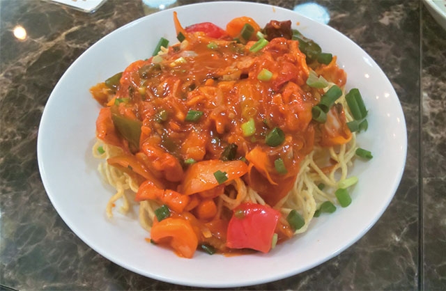 意外にもインドでも中華は人気。チャプスイはアメリカ生まれの肉や野菜のあんかけ中華で、インドではアメリカンチャプスイと呼ばれています。かた焼き麺にトマトケチャップで味つけされた甘酸あんがかかっており、やみつきになる味わいです。