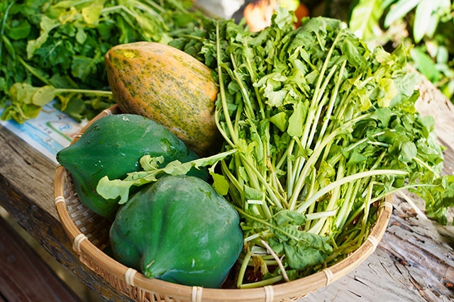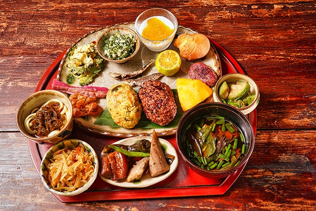 島野菜をふんだんに使った料理を味あわせてくれる店はたくさんありますが、沖縄本島のやんばる、大宜味村にある「笑味の店」は自信をもっておすすめできる店のひとつ。店主の金城笑子さんは、店の前にある畑で自ら野菜を育て、郷土料理にして提供してくれます。「まかちくみそーれ(おまかせください)」という名のおまかせ御膳には、季節の島野菜がたっぷり。地元のおばぁから学んだという料理は、土地に伝わる昔ながらの長寿食。沖縄の食文化を代表する言葉「命水(ぬちぐすい)=食は命の源である」を体感することができます。