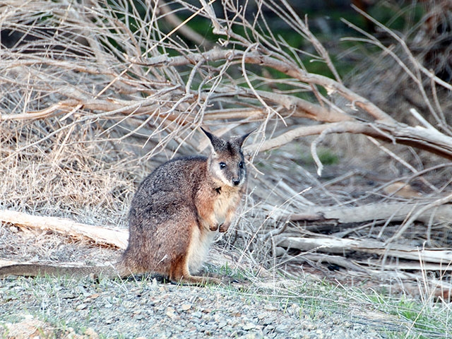 ツアーでは午後遅めから夕方にストークスベイStorkes Bayから島の中心都市キングスコートへ島の中北部海岸近くの道路を通りました。この一帯では牧草地に多くにカンガルーアイランドカンガルー(カンガルー島固有種)が現れ、藪の中にはティマーワラビー、さらにユーカリの木も上にはコアラを何頭も見ることができたのです。カンガルーやワラビーもかなり数を減らしたということでしたが、その姿を見るにつけ、どんな逆境があろうとも、自然の中でたくましく生きる野生動物の強さを実感することができました。