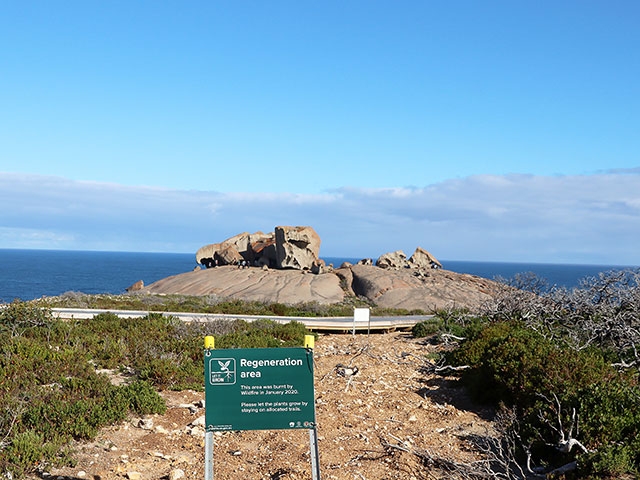 そんな中、フリンダーズチェイス国立公園随一の景勝地であり花崗岩の奇岩が海沿いに残るリマーカブルロックス。ブッシュファイヤー後の報道映像をよく覚えているのですが、その時は奇岩の周りの大地は完全に黒焦げでした。今は緑の藪も大分復活。駐車場から岩へ続くボードウオーク周辺には「Regeneration area」の看板があり、ゆっくりとではあるものの植物が芽吹き始めているのを知ることができます。