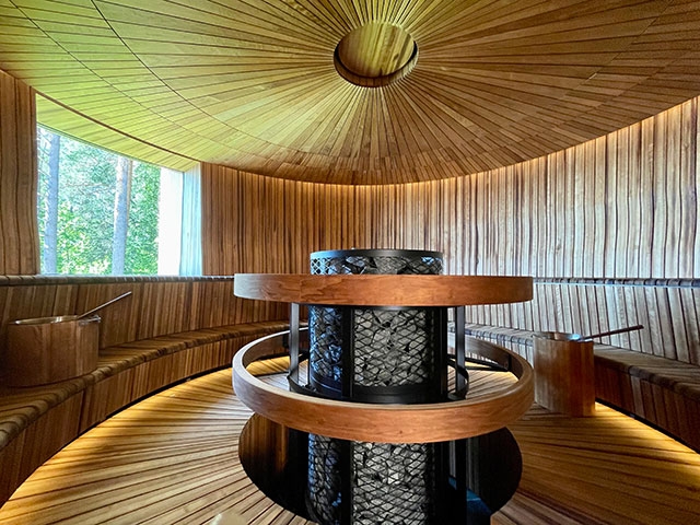 一般的なサウナは四角い箱型ですが、こちらのサウナは珍しいラウンド型。オークを放射状に組んだモダンなデザインで、美術館の建築家と同じ方が造ったのだそう。箱型よりもゆっくりと時間をかけて水蒸気が広がるので、そのぶんサウナストーンもたくさん積まれています。温度はやや低めに感じましたが、個人的に高温のサウナが得意ではないので、むしろありがたい。窓からは穏やかな湖が眺められ、ずっと入っていても苦しくない居心地のよさ。木の香りとやさしいロウリュの蒸気に包まれて、完全にリラックスできます。