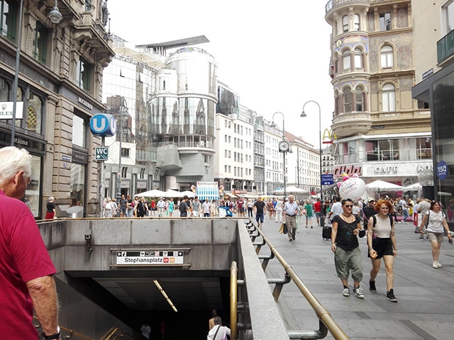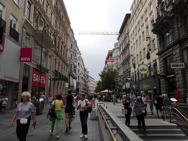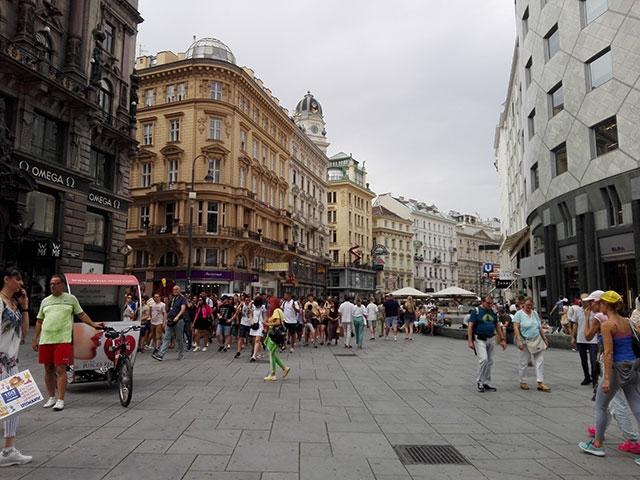 ウィーンの夏の終わりは突然の雷雨が発生することが頻繁にあり、天候が安定しません。しかしながら、降水確率が高く湿気の高いこの日も、地元民以外にも個人旅行者から団体の観光客まで絶え間なく街歩きをする人々で賑わっています。目的はショッピングや食事に観光と様々。