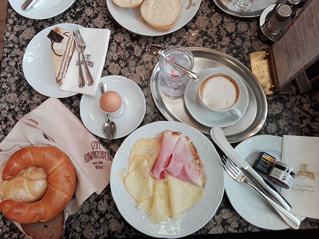 ウィーン観光中には、午後にコーヒーとケーキを楽しむことを目的にカフェハウスを訪れる客がほとんどですが、伝統的な朝食も試す価値あり。組み合わせ自由の単品から量の多いセットまでメニューは種類豊富ですが、中でも伝統的なウィーン風朝食がお勧め。オーストリア発祥のパン「カイザーゼンメル」にバターと蜂蜜またはジャムが付く朝食を味わってから夏の一日をスタートしてはいかがでしょうか。