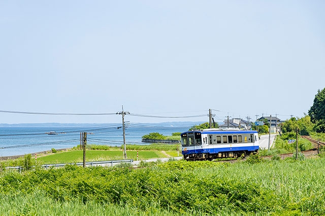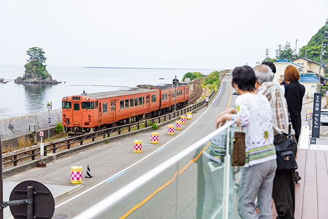 ローカル線のひなびた風景を撮りたくて、富山から能登へ。ここは雨晴海岸という名所で、冬の晴れた日には海の向こうに雪をかぶった立山連峰が見えるそうです。海岸の前には道の駅の展望デッキがあって、観光客のみなさんも、列車を狙ってスマホを構えていましたよ。