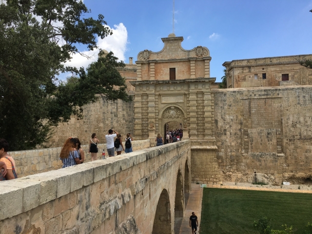 町に入るにはヴァレッタ同様、やはりハチミツ色をした頑丈な橋を渡り、威厳のあるゲートをくぐります。すぐ右手には国立自然史博物館(Palazzo Vilhena)が、左手には土産店があります。