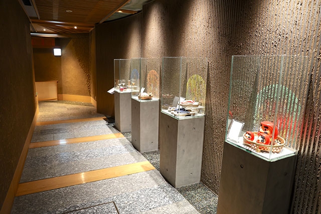 客室や館内、どこにいても優雅な気分になれるのは、いたるところに組子障子や和紙の雲母刷り、スサ入りの天然土壁、江戸墨流しのふすま絵など、職人の技術が詰まった伝統工芸が設えられているからでしょうか。美術館を思わせる回廊には、松本エリアが誇る伝統工芸品が展示されており、ちょっとした部屋までの移動も楽しくなる、そんな温泉旅館になっています。