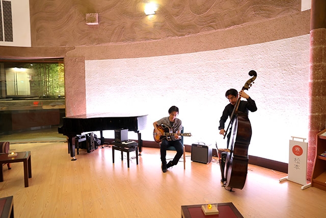 またチェックインを行ったロビーフロアが夜になるとコンサートフロアに様変わりし、毎晩ジャズやクラシックの生演奏を催行。こちらは宿泊者であれば誰でも参加できるイベントですが、「手業のひととき」参加の方にはデザートワインが振る舞われます。ワイン片手に生演奏を楽しみながら、カラダは温泉のおかげでポカポカ。あー、なんとシアワセな旅!秋から冬にかけて、ワインと音楽をテーマに界 松本を訪れてみてはいかがですか?
