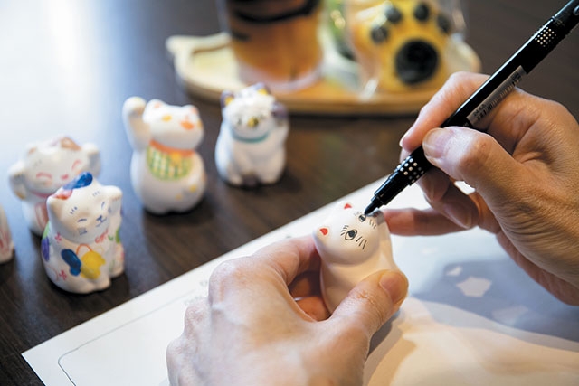 その隣にある姉妹店の「カフェ猫衛門」では、お茶とお菓子をいただきながら、招き猫の絵付けが体験できます。好きな招き猫を選んで、キャラクターを描いたり、服を着せてみたり。絵付けした招き猫は、家に飾って、あとは福を招いてくれるのを待つだけ。
