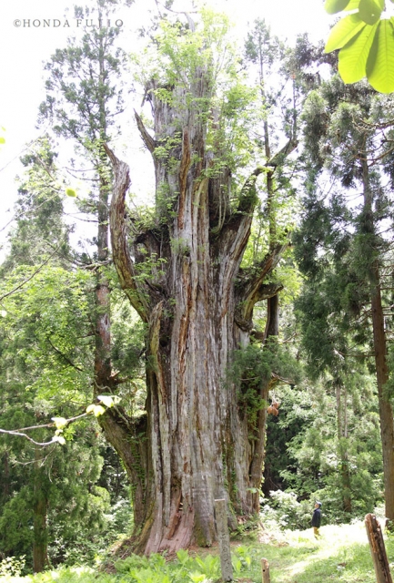 伝承によれば、聖地白山を開いた泰澄大師(687-767)が立てた杖が生長したものといいます。約1300年前のことです。ところが専門家によれば、1800年から2000年の樹齢を数えるとも。かつて聖なる白山を目指す美濃禅定道の二十八宿のひとつ「今清水」があったとされ、山伏行者らがここで大杉を拝してその神気に浴し、霊水をいただいて鋭気を養ったといわれています。
