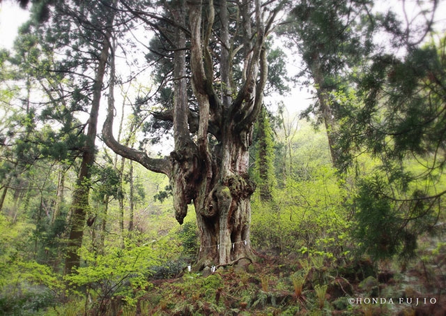 青森県の津輕鉄道線「金木」駅から車で約20分。ナビがなければ不安で引き返したくなるような山道脇の森の中に、その怪樹がそびえ立っています。