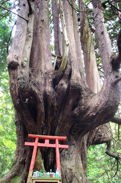 この木もまた、一度見たら忘れられないインパクトです。赤い鳥居が立てかけられた幹はいったん鳥居上部ですぼまり、人の背丈を超える高さのあたりからぐっとエネルギーを溜め込むように膨張し、そこから12本の枝幹を一気に天に向けて分岐させています。ちなみに、樹種はヒノキアスナロ(一般にはヒバの名で知られています)。十二本ヤスの「ヤス」とは魚を突く漁具のことで、その形状を思わせることに由来します。