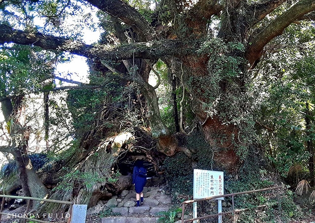伊豆半島の西南端、半島をめぐらす国道からクルマ一台がやっとの細い道に入り、たどり着いた海岸の近くに鎮座する白鳥神社。その木は、異界を思わせる最果ての森の門番としてそびえ立っていました。