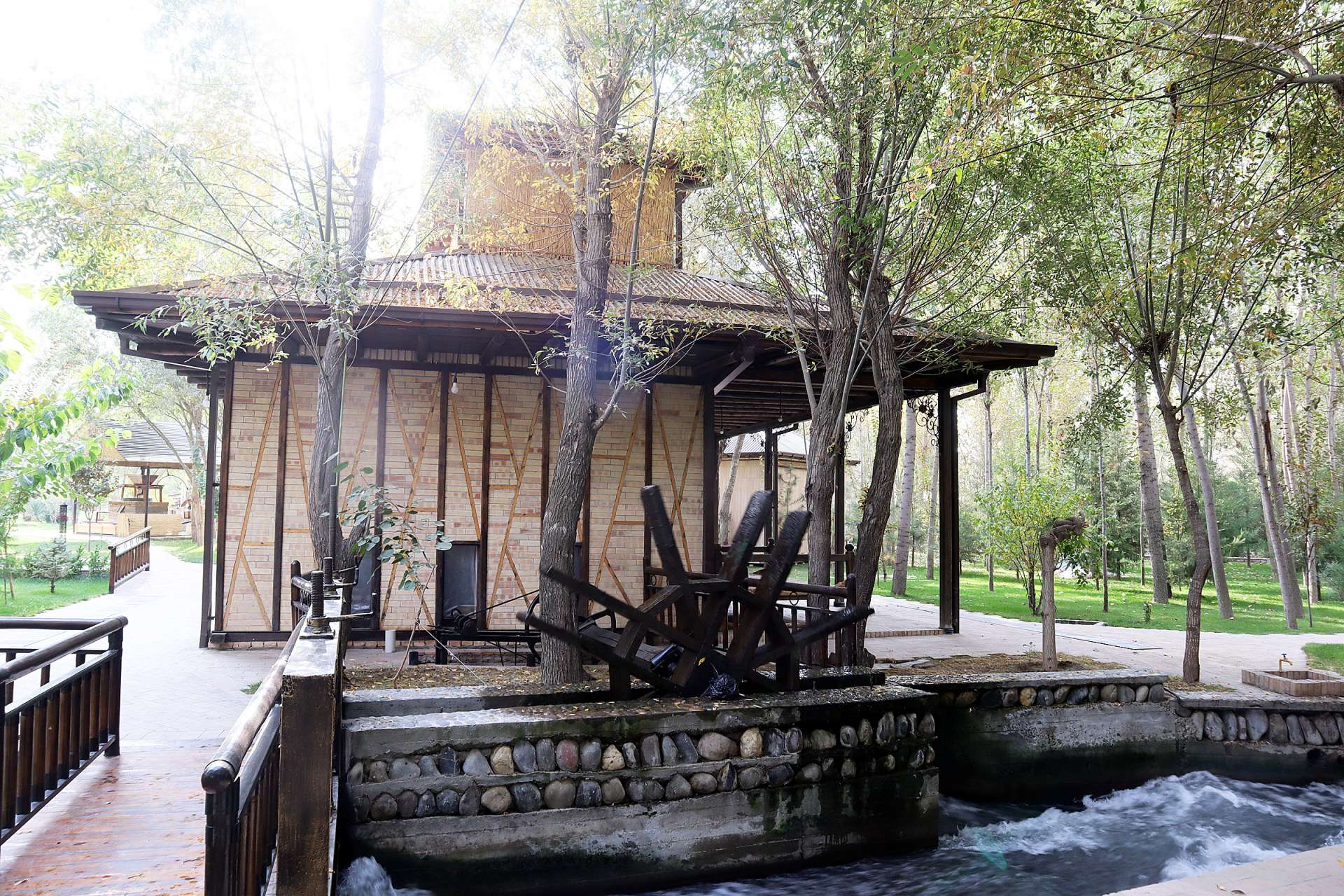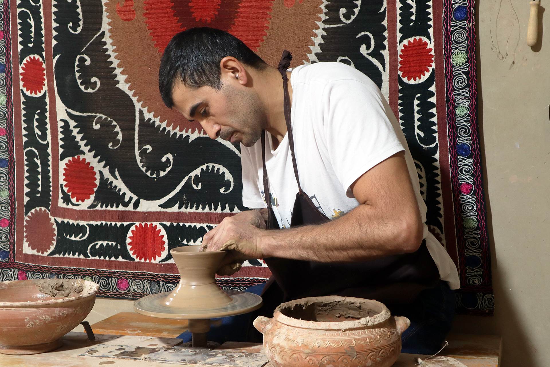 小川沿いに遊歩道ができ、入口のメロス紙すき工房から、粉ひき、油ひき、水くみなどの水車小屋が続き、途中にはここでひいた粉でナンを焼くベーカリーなどもあります。そしていちばん奥には水車で粘土をつき陶器を造るサマルカンド焼きのボボムロドフ工房。ウズベキスタンを代表する陶芸家ボボムロドフ氏とその息子の手による陶器の制作現場見学や陶器購入も可能。さらにここでは、コニギリ村で取れた米や野菜、肉、村で作った油をつかったコニギリ村伝統のプロフ(油たきこみご飯)も味わえます。