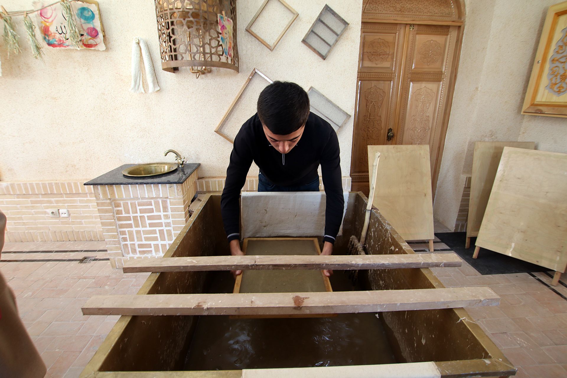 ザラフシャン川の支流沿いに古くからの家並みが残るコニギリ地区。2001年頃から水車を使って桑の木片をつき、一度は廃れたサマルカンドペーパーを復活させる試みでメロス紙すき工房がオープン。2010年からはJICA支援の下、和紙職人の協力なども得てサマルカンドペーパーの制作工程が見学できる場所として注目されていました。