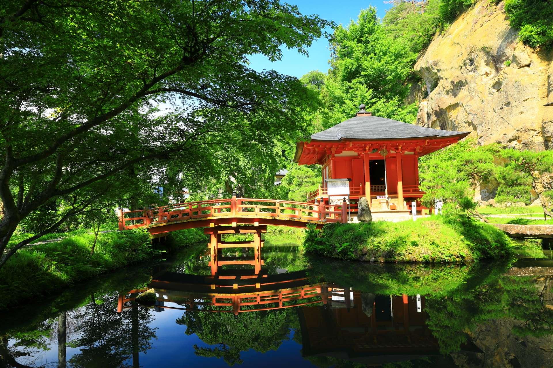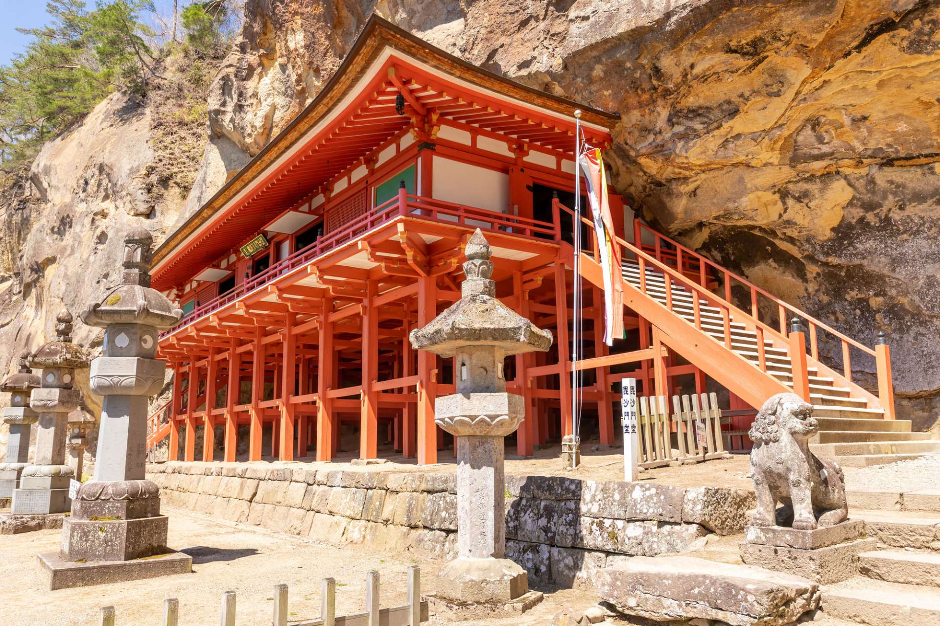 続いて、ダイナミックな自然と一体化した岩手のスポットをご紹介。こちらはおよそ1200年前、征夷大将軍の坂上田村麻呂が蝦夷征伐の成功を祝い、毘沙門天の加護に感謝して開いたお寺です。境内は御神域とされているため、鳥居が設けられ凛とした空気がただよいます。崖にはりつくように立つ毘沙門堂は、京都の清水寺を模した懸造りです。