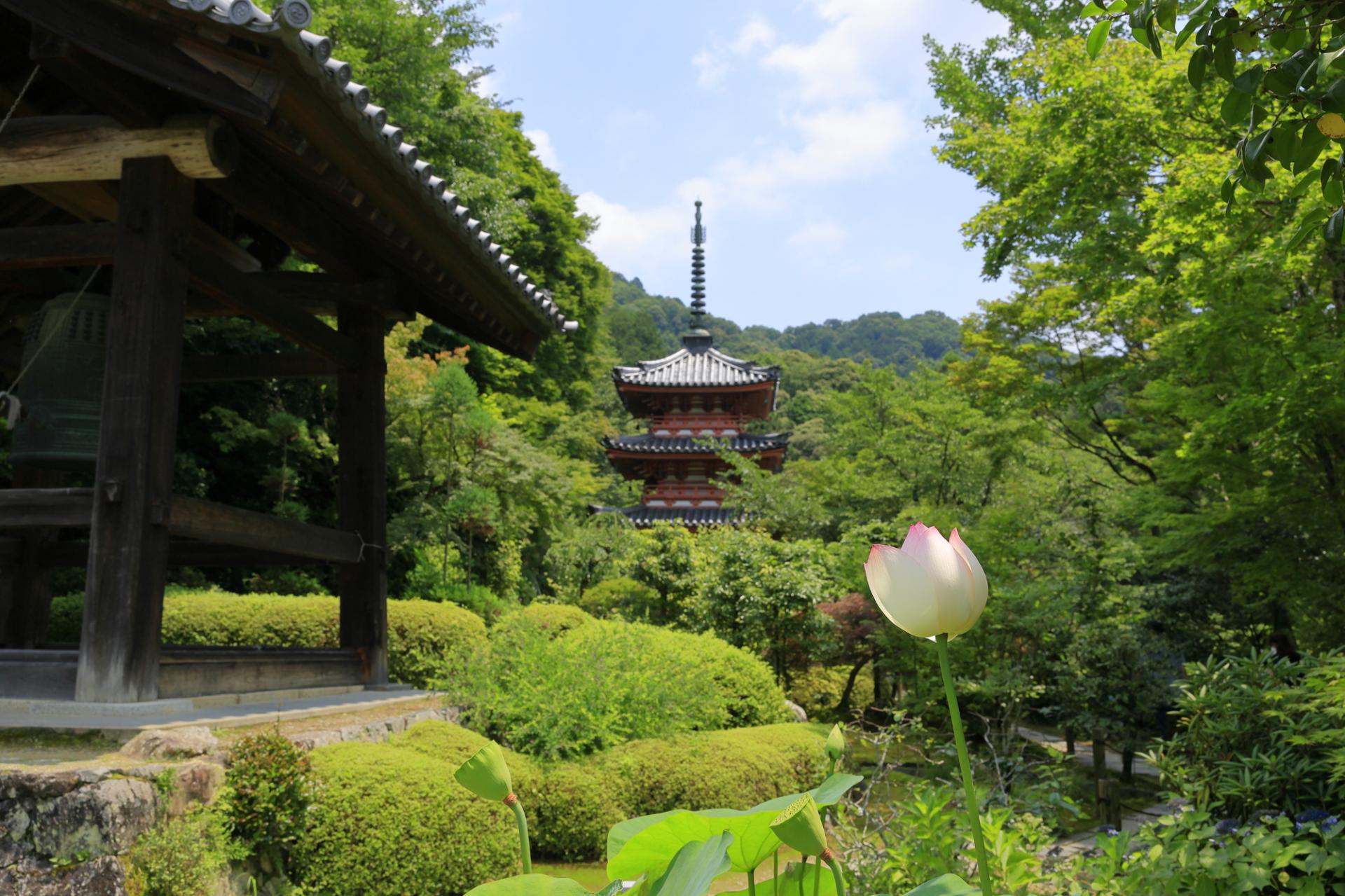 夏の参拝にもおすすめなのが京都・三室戸寺。御本尊は千手観世音菩薩で、西国十番の観音霊場です。境内には5000坪もの大庭園が広がり、50種2万株のアジサイ、2万株のツツジが栽培されています。夏には本堂前の「蓮園」にハスが咲き、秋になれば鮮やかな紅葉が境内を彩ります。本堂前には御影石造りの福徳兎像や、なでると金運に恵まれるという宇賀神像があります。