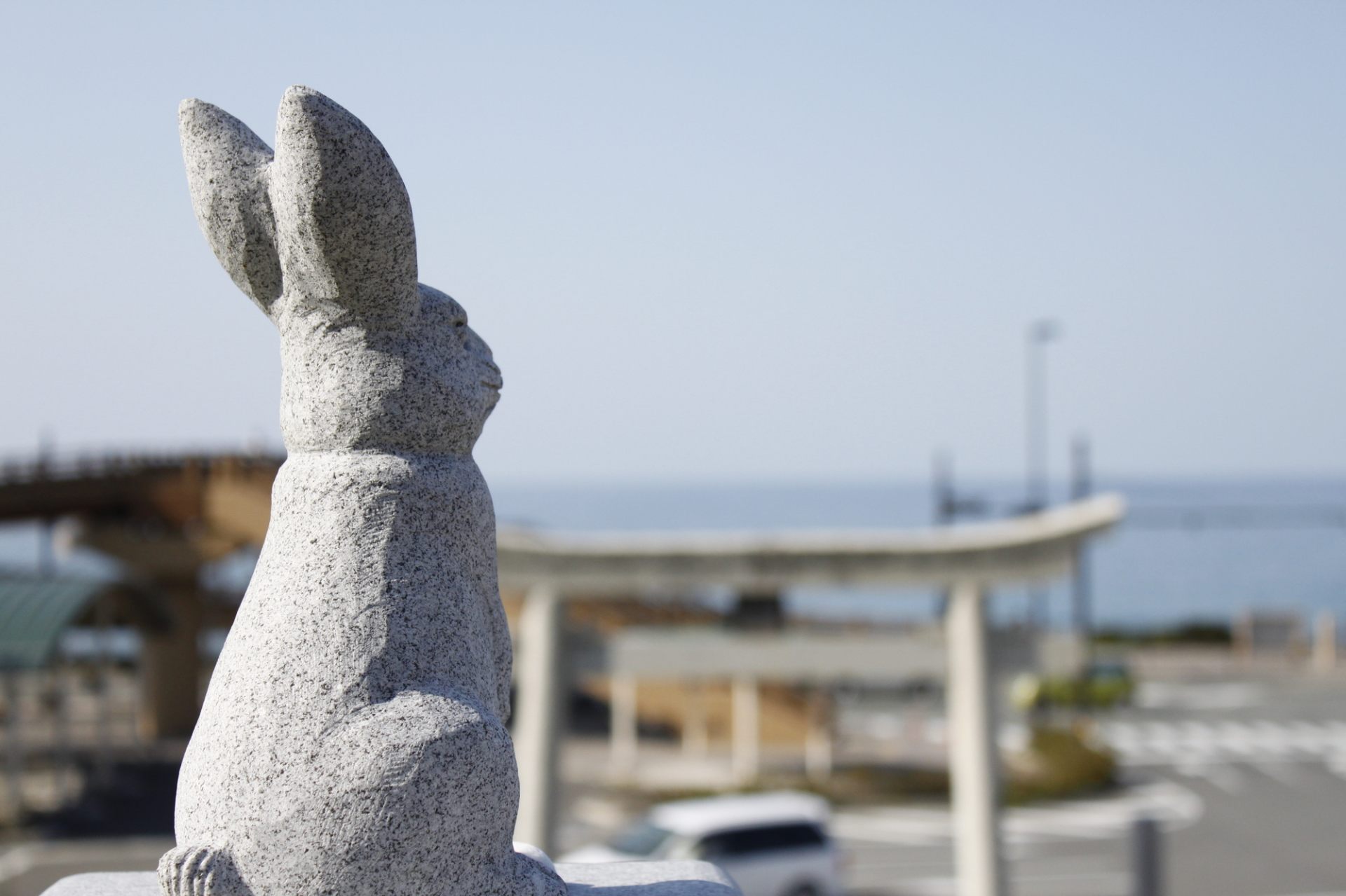 神話の舞台、白兎海岸は日本最古のラブストーリー発祥地。境内にはかわいらしいウサギの像がたくさんあります。