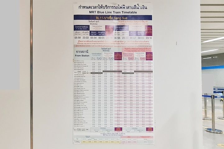 乗り換え後に利用するMRTブルーラインは運行本数が多いですが、朝夕の通勤時間帯はかなり混みあうことがあります。コロナ前のラッシュ時にはホームに上がれないこともあったので、時間には余裕をもって移動したほうがいいでしょう。MRTバンスー駅発のラックソン駅行きは平日5:58~23:33、土日祝日は5:55~23:33、タープラー駅行きは平日5:54~00:05、土日祝日5:57~00:05です。時刻表については変更になる場合があるので注意してください。