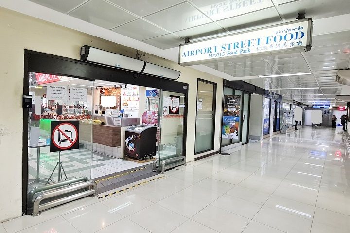 途中の通路沿いに、薬局、コンビニエンスストア、フードコート、コーヒーショップがあります。