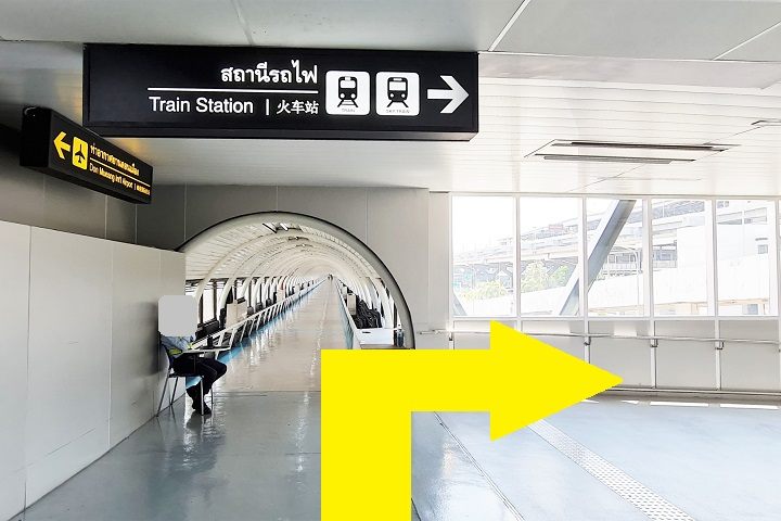 案内どおりに進み、上記写真の案内表示で右に曲がります。SRTドーン・ムアン駅に近づくと、右手に「Long Distance Train」、左手に「Commuter Train」の入口が見えるので、左手のCommuter Trainの方向へ進みます。