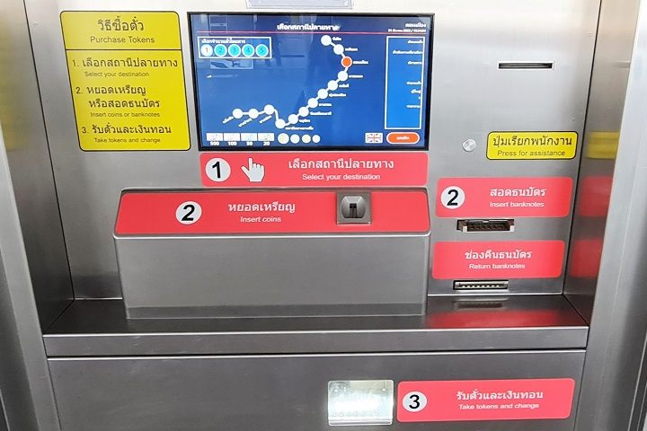 トークン購入の手順は、(1)行き先を選ぶ(2)硬貨または紙幣を入れる(3)トークンとお釣りを受け取る、の3ステップでシンプルです。100バーツ以下の紙幣や硬貨がない場合は、係員のいる窓口へ行って両替してもらうか、行き先を告げてトークンを購入することをおすすめします。