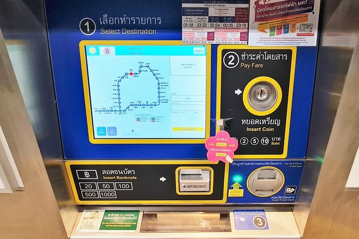 MRTブルーラインのバンスー駅で、MRTスクムウィット駅やシーロム駅など、行きたい駅までのトークンを購入します。トークンの購入方法は、レッドラインとほぼ同じですが、MRTの券売機では、トークンを1人分ずつしか購入できず、券売機によっては紙幣が使えない場合があります。硬貨や紙幣がなく券売機でトークンを購入できない場合は、駅係員のいる窓口で、行き先の駅名を告げることでトークンを買うことができます。なお、MRTの券売機でトークンを購入する場合、お釣りが出てくるのに少し時間がかかりますので、取り忘れに気をつけましょう。