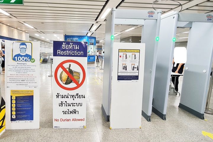 MRTに限ったことではありませんが、改札前には手荷物検査があります。ニオイの強い果物ドリアンの持ち込みは許可されていません。