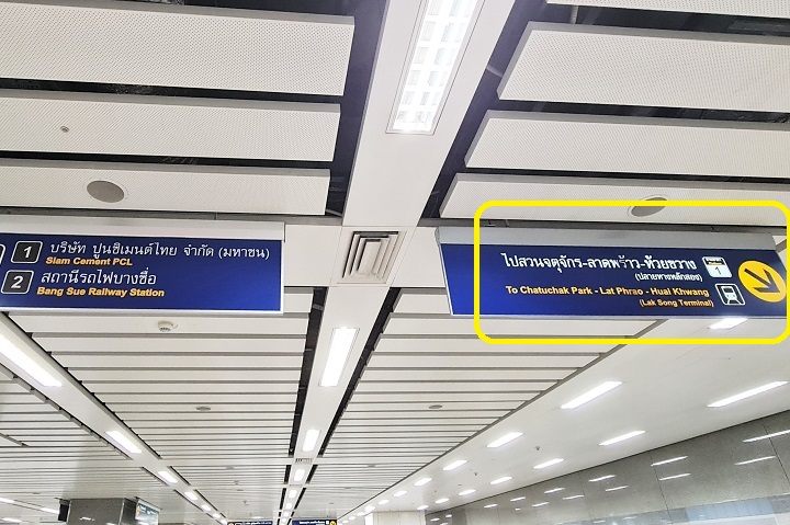 SRTバンスー中央駅(新駅名:クルンテープ・アピワット中央駅)に到着したら、MRTブルーラインのバンスー駅まで徒歩で移動します。駅構内にMRTバンスー駅への案内がありますが、乗り場がわからない場合は、「Where is MRT(エムアールティー)?」や「MRTユーティナイクラップ?(自身が男性の場合)/ユーティナイカ?(女性の場合)」と聞けば大丈夫です。