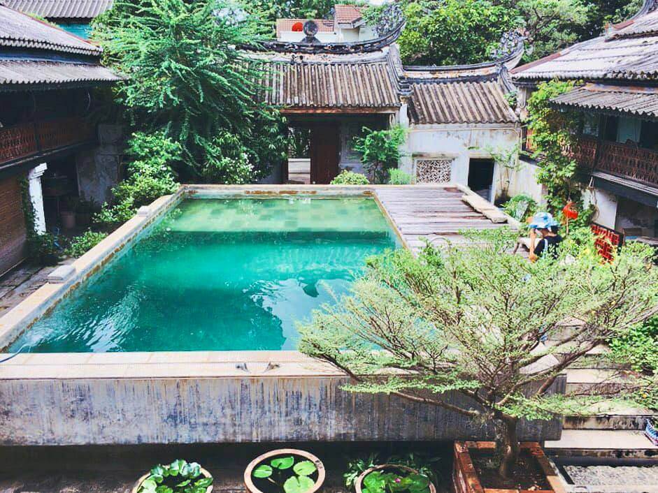 門をくぐると目の前に現れるのは、立派な中国式の邸宅。存在感がある中庭のプールは深さがあり、ダイビングの練習に使われています。