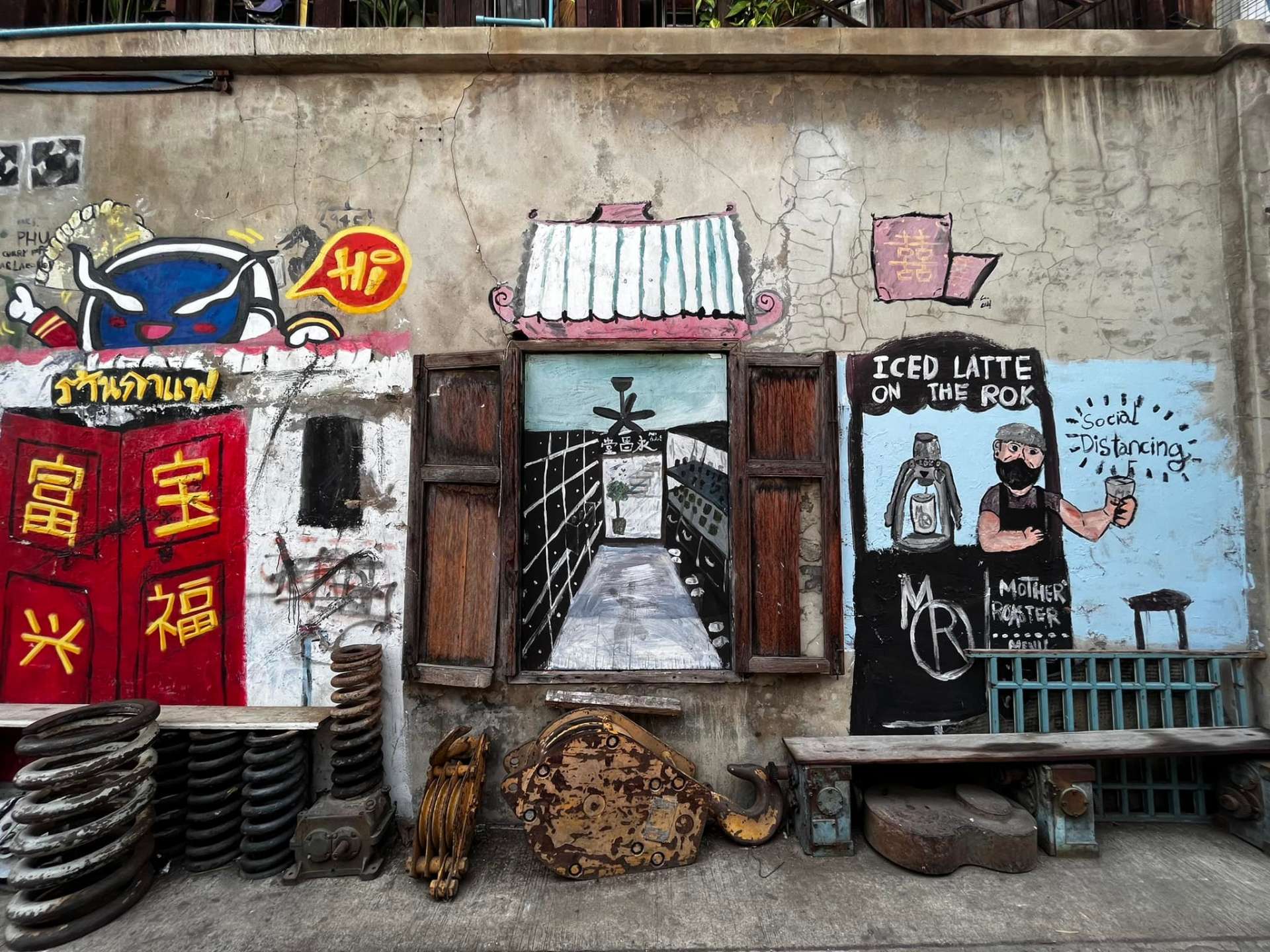 70歳を超えたパワフルなバリスタおばあちゃんが経営する本格コーヒーショップ「マザーロースター(Mother Roaster)」は、かわいいウォールアートが目印で、カメラを手にした若者たちが集う人気の撮影スポット! 建物1階に横たわる山積みの廃材に圧倒されつつ、狭い階段を上がって2階に進むと、カフェの入口があります。