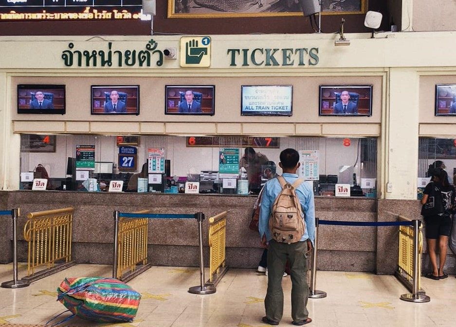 減便されたもののまだ列車は動いているとのことで、国鉄に乗ってみようと9月25日に「フアラムポーン駅」を訪問しました。チケット売り場で「新バンスー駅」行きのチケット(片道2バーツ)を購入し、駅のホームへ。