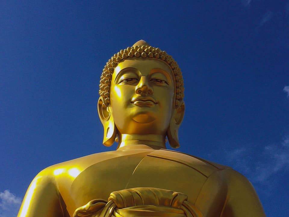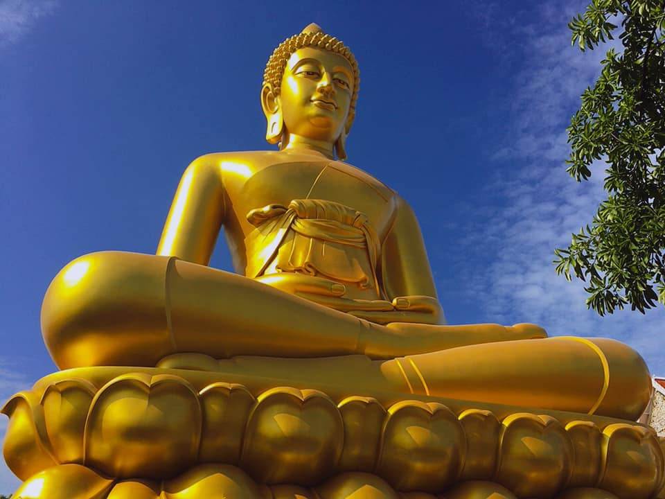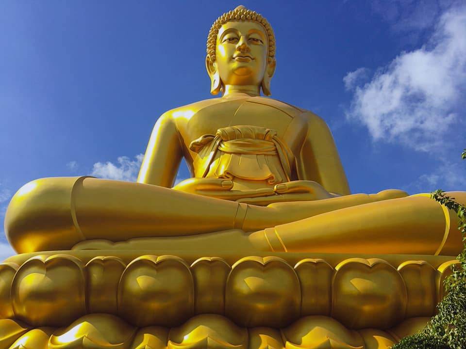 そしてこの「大仏塔」のすぐ隣に建設されたのが、高さ69m、幅40mの「巨大仏像」。タイ国内で3番目に大きな仏像となります。2017年から建造がはじまり、今年6月に完成しました。黄金に輝く仏像が青空によく映えて、その存在感と迫力に圧倒されます。