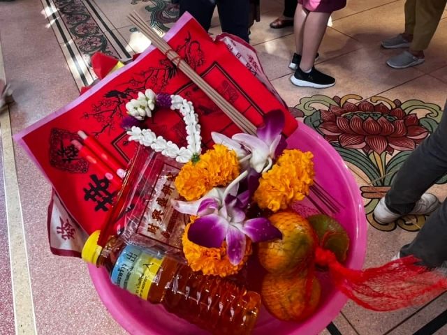 筆者もお供えセット140バーツ(約500円)を購入し、お参りしました。