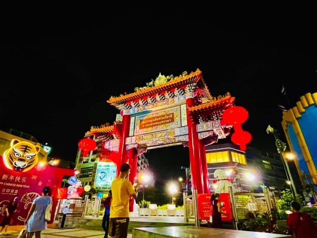 中華街ヤワラートが本領を発揮するのは、怪しげなネオンが光りだす日没後。2月2日の夜、筆者も友人たちとチャイナドレスを着て、夜のヤワラートに繰り出しました。中華街門の周辺はカラフルなランタンで彩られ、美しいイルミネーションが設置されています。